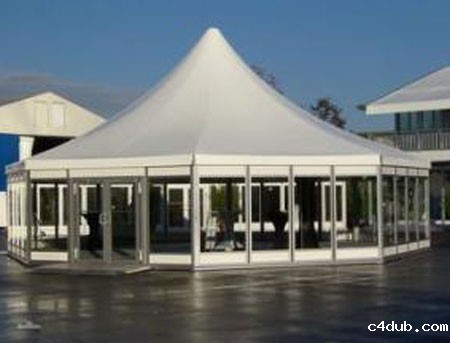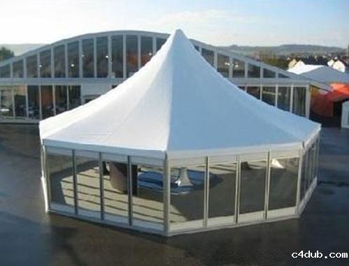 ,顶部是尖行,框架搭建的是六边形,组合起来就是六边尖顶篷房,这种属于欧式篷房,很多婚礼,宴会,庆典的时候都会选用这种六边尖顶篷房。